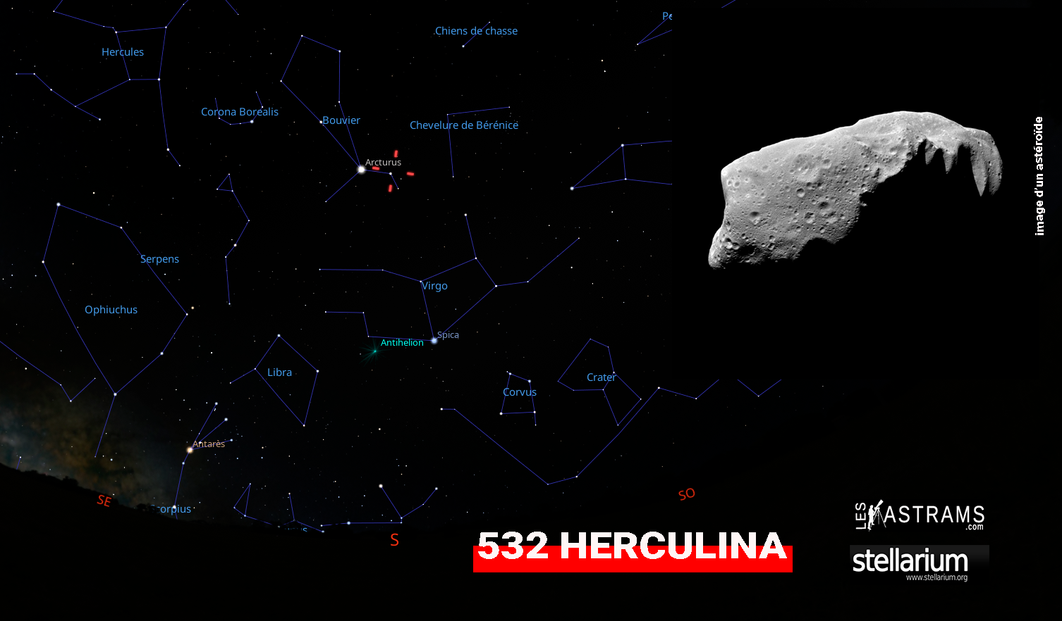 LUNDI 08 13:14 Opposition de l'astéroïde 532 Herculina avec le Soleil (dist. au Soleil = 2,283 UA; magnitude = 9,0)
