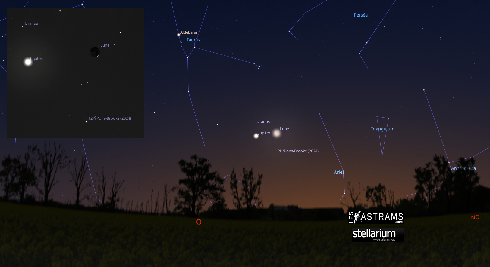 MERCREDI 10 Rapprochement entre la Lune et Jupiter (dist. topocentrique centre à centre = 0,4°). La comète 12P/Pons-brook sera de la partie. Au crépuscule à l’Ouest sous la constellation du Taureau. CARTE