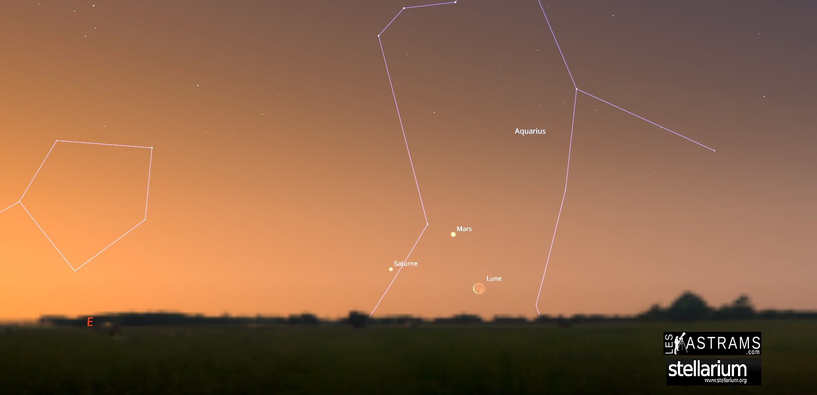 SAMEDI 06 05:57 Rapprochement entre la Lune et Mars (dist. topocentrique centre à centre = 2,7°)Essayer d’observer la planète rouge au-dessus du croissant lunaire avant le levé du Soleil. Les 2 objets seront très bas à l’horizon Est dans la constellation du Verseau. CARTE