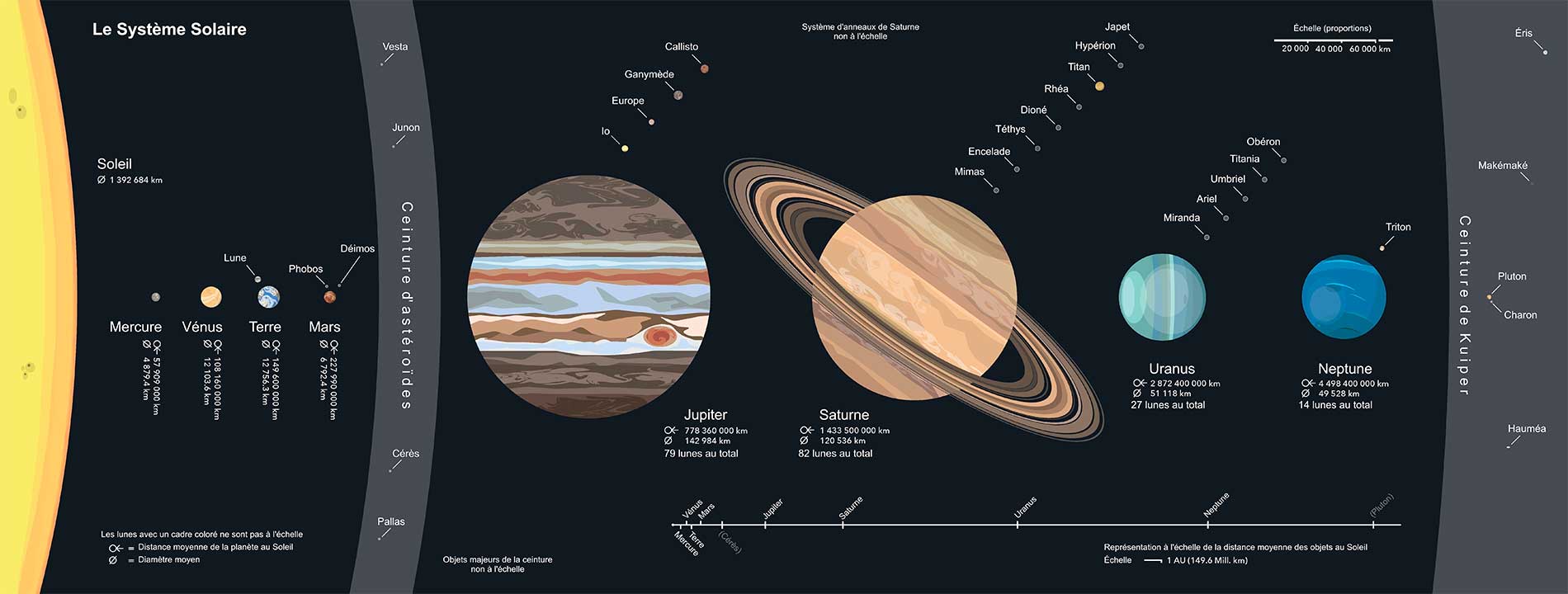 Remettons un peu d’ordre sur la position de ces planètes par rapport à notre étoile. En partant du soleil à gauche nous avons Mercure, puis Vénus, la Terre et sa Lune, Mars, Jupiter, Saturne avec ses anneaux, Uranus et Neptune.