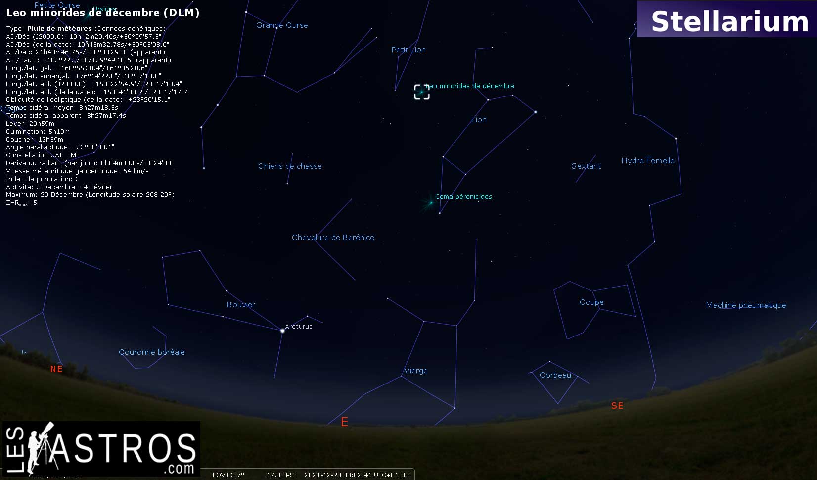 En milieu de nuit vers 23:00 heure locale, il faut guetter les météoroïdes à l’Est au {tip content=" Point du ciel situé vers le haut et à la verticale de l'observateur"}zénith{/tip}, entre les constellations du Lion et du Petit Lion. La {tip content=" Groupe d'étoiles voisines sur la sphère céleste, présentant une figure conventionnelle déterminée, à laquelle on a donné un nom particulier. Région du ciel dans laquelle se trouve ce groupe d'étoiles"}constellation{/tip} du Petit Lion (Leo Minor) est de petite taille et ne comporte que peu d’étoiles lumineuses. Pour la localiser regardez entre la Grande Ourse au nord et le Lion au sud. Le pic est prévu le 20 vers 5h TU, mais la pleine Lune pourrait bien gêner les observations. 5 météores/heure devraient être observables.