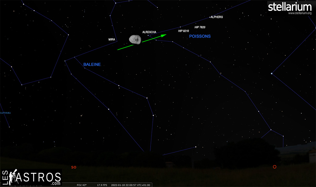 Avec une magnitude 10, il sera visible dans la constellation des Poissons le 18 janvier, ou il sera le plus proche de la Terre à 21 h51 UTC.
