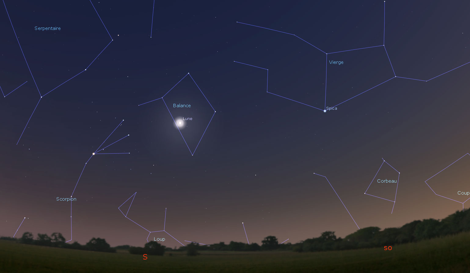 La Lune du week-end du 9/10 juillet sera gibeuse croissante et située dans la constellation de la Balance (Libra) avant de passer dans celle du Scorpion, en direction du Sud.